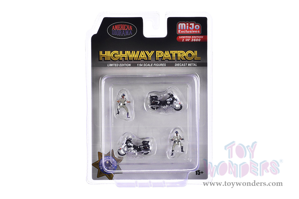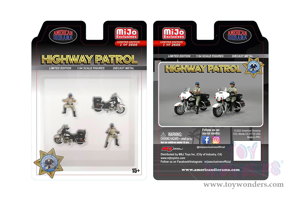 AD-64529MJ American Diorama/Mijo Exclusives - Highway Patrol Figure & Bike Set. Scaled for 1:64 scale model cars or 1:64 scale dioramas. This exclusive Highway Patrol Multipack includes: 2 figurines and 2 motorcycles. Each figure is approximately .5 - 1 inches tall. Limited Edition to 3600 pieces. Die Cast Metal. Card size: 5.5"W x 7.5"H.  Manufactured by American Diorama for Mijo Exclusives. 12 sets per inner.