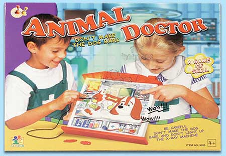 3355 Animal Doctor. The Animal Doctor, a game of skill is a 13"x10.5" Animal doctor box that includes: mini plastic junk foods in the animal, a big dog, and tweezers connected to the game. Batteries required to operate.