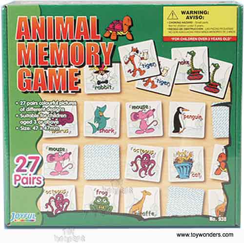 938 Animal Memory Game. Includes: 27 pairs of colorful picturesof different designs, suitable for children ages 3 or above. Assorted animals and colors on each game card. 12 pcs/inner.