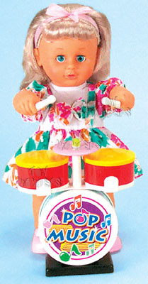 16146 Anita - Musical Drummer 15" musical doll w/ drum set. when music plays, she drums to the beat of the music. In a TRY ME box. Includes 3"AA" batteries. Box size: 7.75"Lx9.25"Wx14"H.