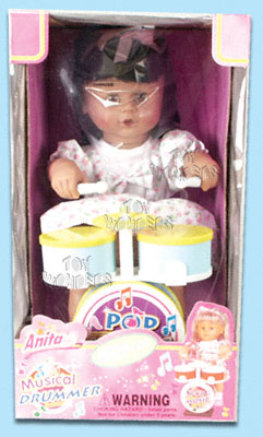 16146B Anita - Musical Drummer (Black). 15" musical doll w/ drum set. When music plays, she drums to the beat of the music. In a TRY ME box. Includes 3 "AA" batteries. Box size: 7.75"Lx9.25"Wx14"H.
