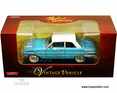 06301 Arko - 1963 Ford Falcon Futura Hard Top. 1:32 scale diecast collectible model car. This Ford Falcon Futura is a 5.5"Lx 2.25"Wx 1.5"H die-cast metal car with openable hood, doors & trunk. Sits on a display plaque. This 1963 Ford Falcon Futura is manufactured by Arko. 06301 is in BLUE color with White roof. Individually packed in a window box. Box size: 8"Lx 3.5"Wx 3.5"H.