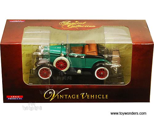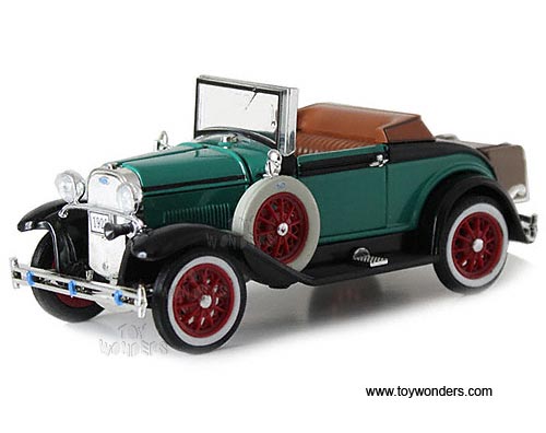 02941GN Arko - 1929 Ford Model A Roadster Convertible. 1:32 scale diecast collectible model car. This Ford Model A Roadster is a 4.75"Lx 2"Wx 2"H die-cast metal car with openable hood, doors & trunk. Sits on a display plaque. This 1929 Ford Model A Roadster is manufactured by Arko. 02941 is in GREEN color. Individually packed in a window box. Box size: 8"Lx 3.5"Wx 3.5"H.