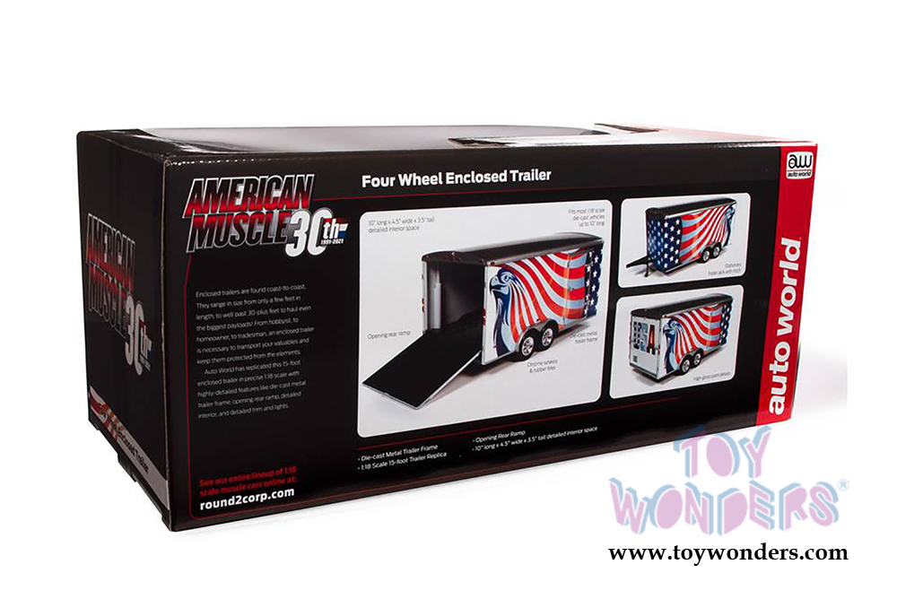 AMM1266 Auto World - American Muscle 30th Anniversary | Four Wheel Enclosed Trailer. 1:18 scale diecast collectible model car. This Trailer is a 13.5"L x 6"W x 5.25"H diecast metal car with opening rear ramp. This Car Trailer is manufactured by Auto World. Individually packed in a window box. Box size: 13.25"L x 6.1"W x 5"H. AMM1266 is in Red, White and Blue (American Flag).