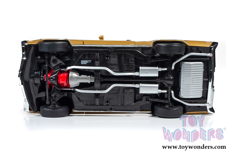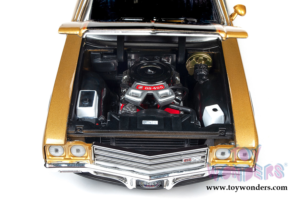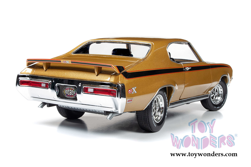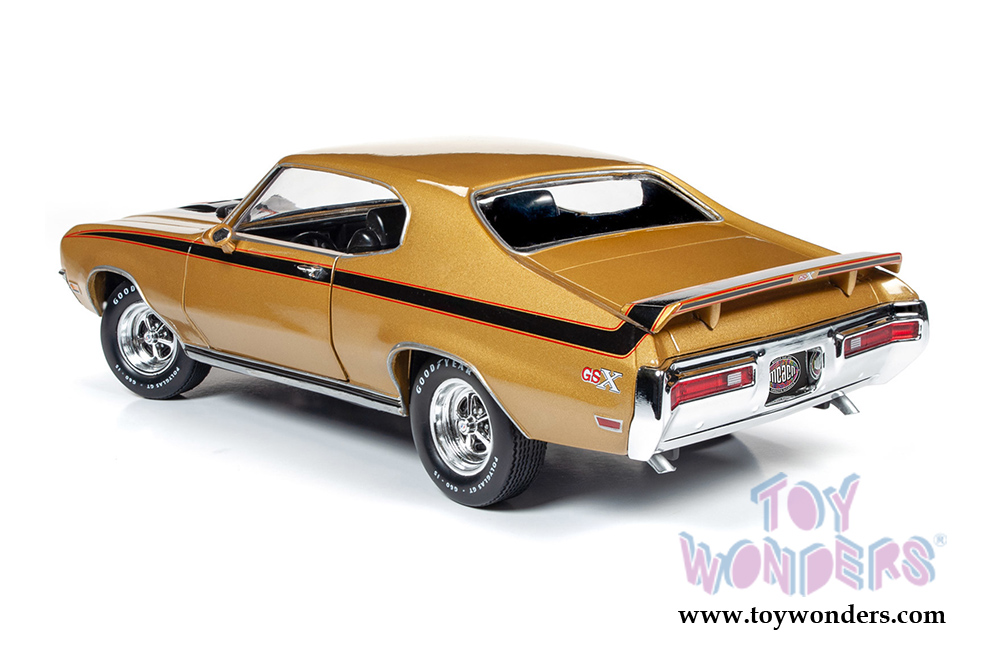 AMM1198 Auto World American Muscle - 1971 Buick® GSX™ Hardtop Muscle Car & Corvette Nationals (MCACN). 1:18 scale diecast collectible model car. This Buick is a 10.5"L x 4"W x 3"H diecast metal car with openable hood and doors. Steerable front wheels and detailed engine, accurate interior, and chassis. This '71 Buick is manufactured by Auto World. Individually packed in a window box. Box size: 13.25"L x 6.1"W x 5"H. AMM1198 is in Cortez Gold with black stripes. Limited Edition.