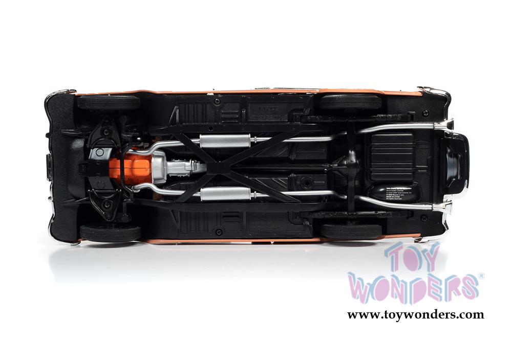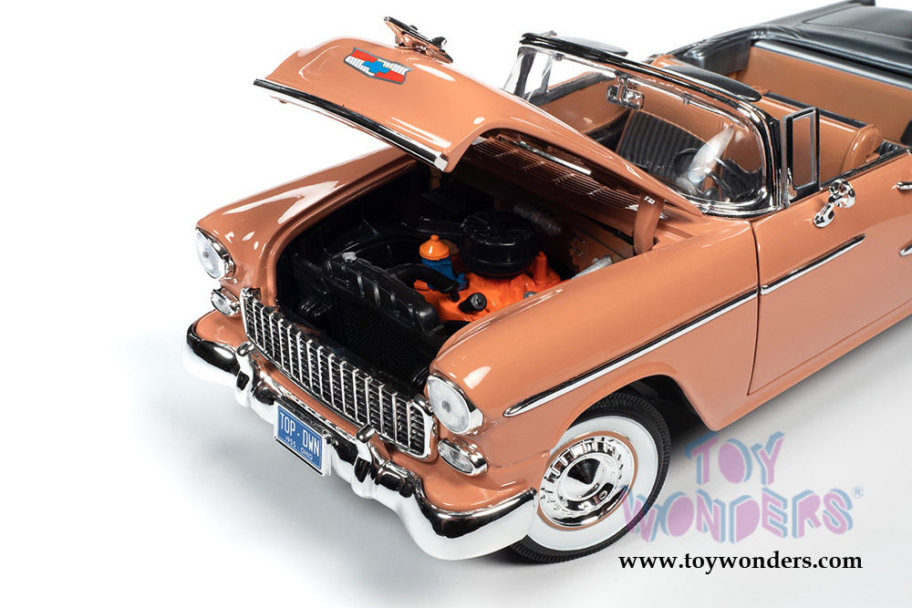 AMM1221 Auto World - American Muscle | 1955 Chevrolet® Bel Air® Convertible. 1:18 scale diecast collectible model car. This Chevy® is an 11"L x 4.25"W x 3.25"H diecast metal car with steerable front wheels, openable hood and doors. Featuring a detailed engine, accurate interior, chassis and trunk. This '55 Chevy® is manufactured by Auto World. Individually packed in a window box. Box size: 13.25"Lx 6.25"Wx 5"H. AMM1221 is in Coral and Shadow Gray.