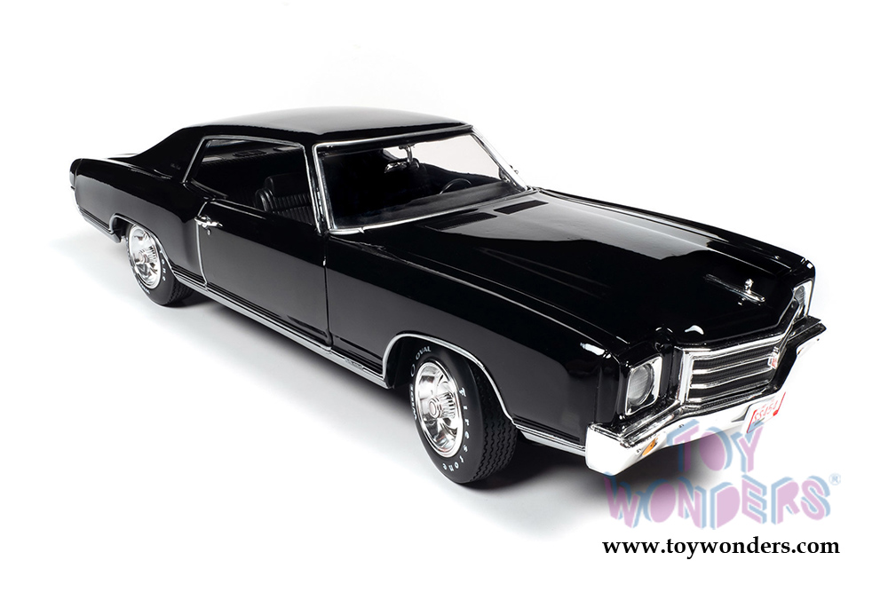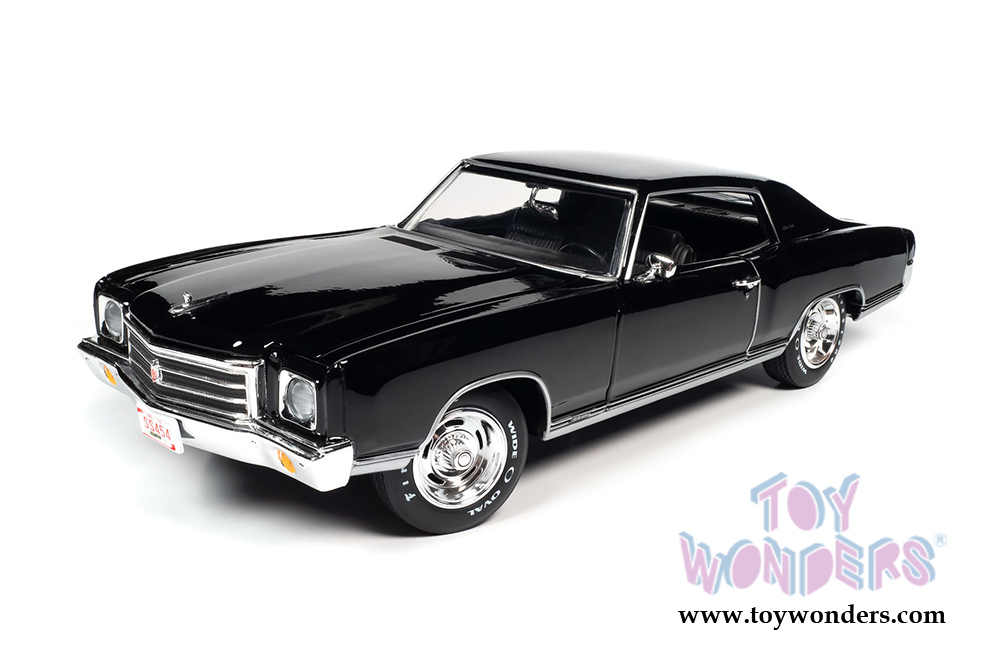 AMM1237 Auto World - American Muscle | 1970 Monte Carlo™ SS™ 454 Hardtop Class of '70 50th Anniversary. 1:18 scale diecast collectible model car. This Chevy® is a 10"L x 4"W x 3.25"H diecast metal car with steerable front wheels, openable hood and doors. Featuring a detailed engine, accurate interior, chassis and trunk. This '70 Chevy® is manufactured by Auto World. Individually packed in a window box. Box size: 13.25"Lx 6.25"Wx 5"H. AMM1237 is in Tuxedo Black.