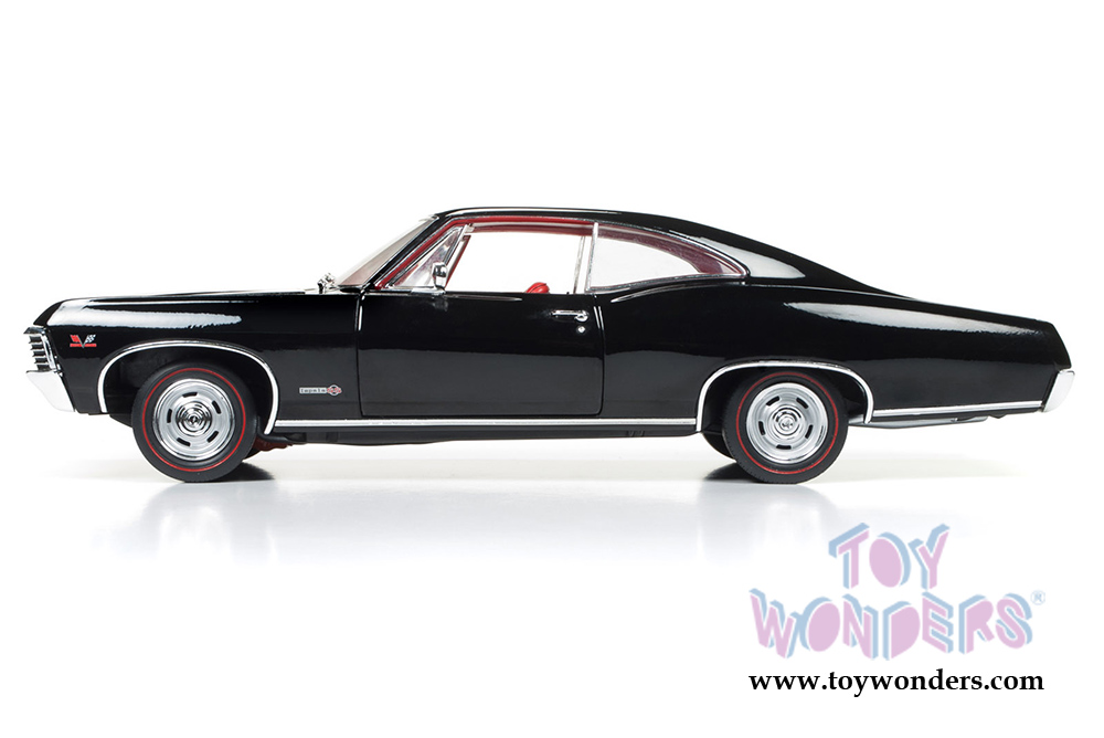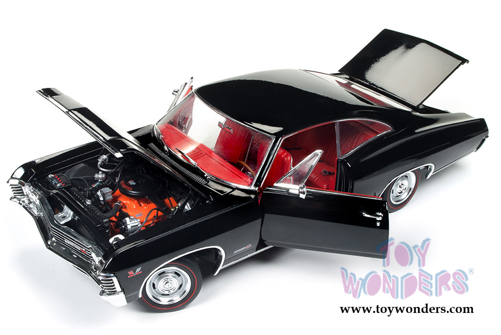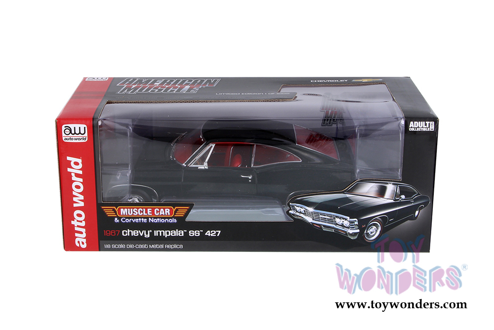 AMM1129 Auto World American Muscle - 1967 Chevy® Impala™ SS™ 427 (MCACN} Hard Top. 1:18 scale diecast collectible model car. This Chevrolet® Impala™ is an 11.5"L x 4"W x 3"H die-cast metal car with openable hood, doors & trunk, steerable front wheels, and detailed engine, accurate interior, chassis and trunk. This 67 Chevy® is manufactured by Auto World. Individually packed in a window box. Box size: 13.25"Lx 6.25"Wx 5"H. AMM1129 is in BLACK.