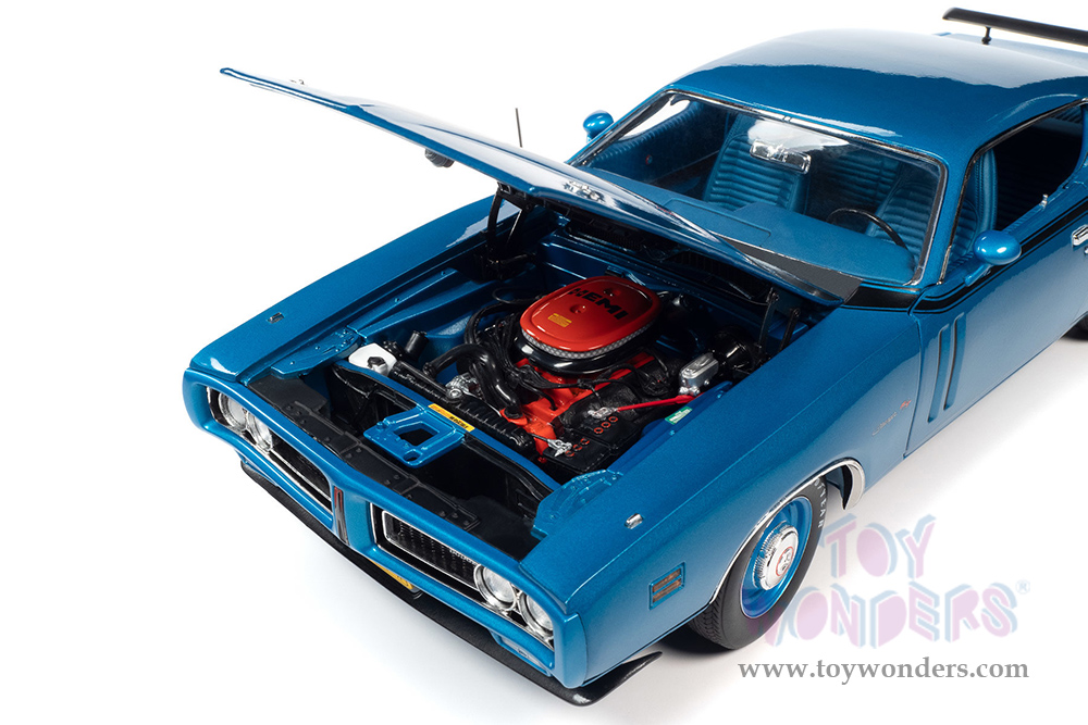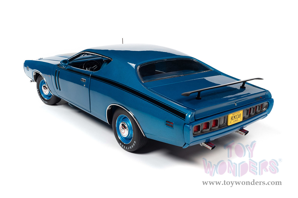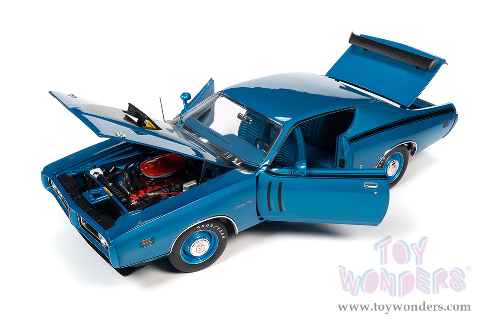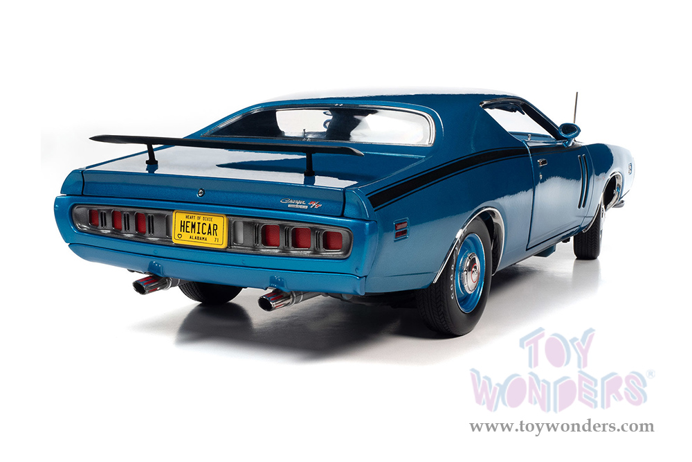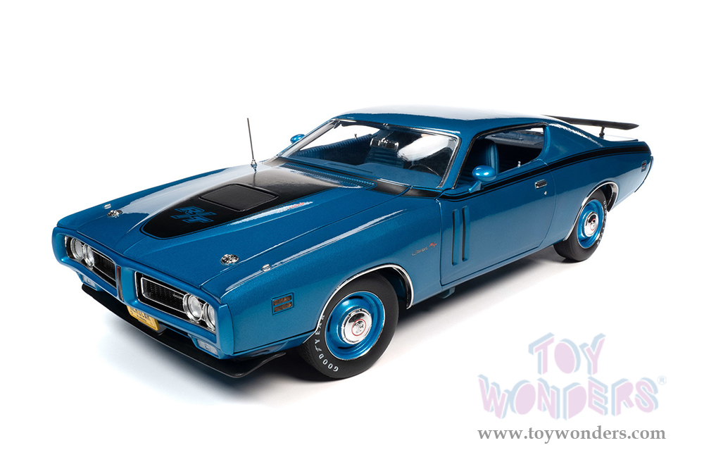 AMM1274 Auto World - American Muscle | 1971 Dodge Charger R/T Class of 1971. 1:18 scale diecast collectible model car. This Dodge is an 11.5"L x 4.5"W x 3"H diecast metal car with openable hood, doors and trunk. Featuring steerable front wheels, detailed engine, accurate interior, and chassis. This '71 Dodge is manufactured by Auto World. Individually packed in a window box. Box size: 13.25"L x 6.25"W x 5"H. AMM1274 is in GB5 Bright Metallic Blue.