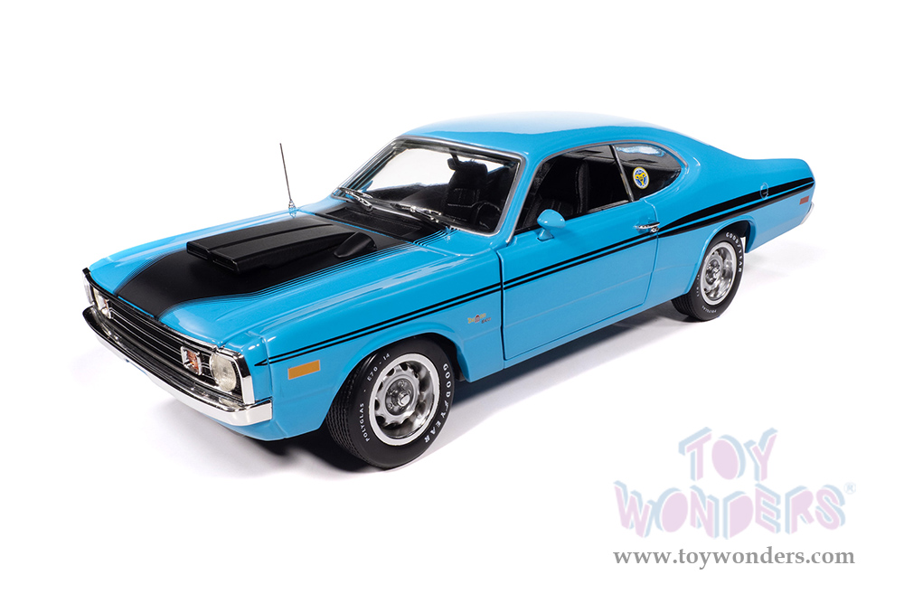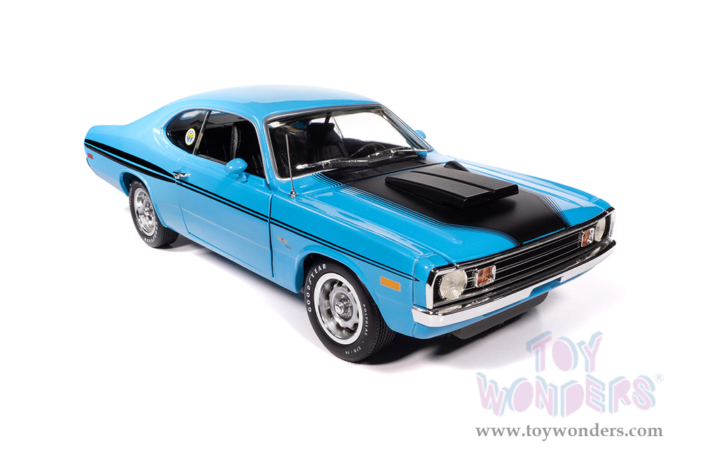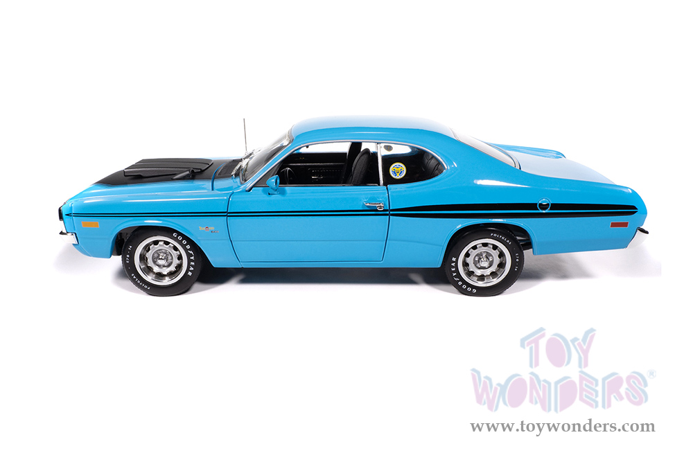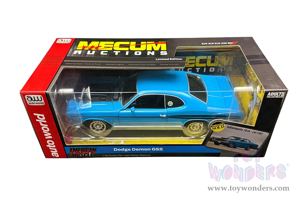 AMM1345 Auto World - American Muscle - 1972 Dodge Demon GSS "Mecum Auctions". 1:18 scale diecast collectible model car. This Dodge is a 10.5"L x 4"W x 3"H diecast metal car with openable hood, doors, and trunk. Featuring steerable front wheels, detailed engine, accurate interior, and chassis. This '72 Dodge is manufactured by Auto World. Individually packed in a window box. Box size: 13.25"L x 6.25"W x 5"H. AMM1345 is in Petty blue with black stripes.