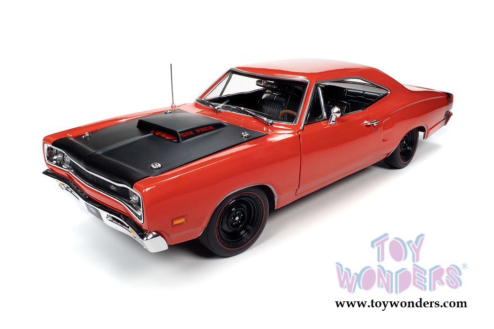 AMM1231 Auto World American Muscle - 1969.5 Dodge Super Bee Hardtop Muscle Car & Corvette Nationals (MCACN). 1:18 scale diecast collectible model car. This Dodge is an 11"L x 4"W x 3"H diecast metal car with openable hood, trunk and doors. Steerable front wheels. Featuring a detailed engine, accurate interior, chassis, and trunk. This 1967 Chevy® Camaro® is manufactured by Auto World. Individually packed in a window box. Box size: 13.25"L x 6.1"W x 5"H. AMM1231 is in R4 Red with black hood. Limited Edition.