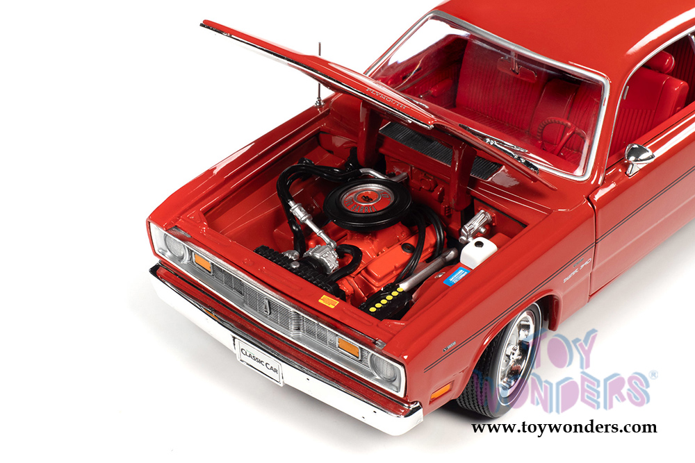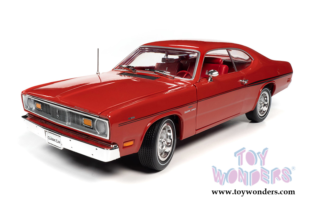 AMM1117 Auto World American Muscle - Hemmings Classic Cars | 1970 Plymouth Duster 340 Hardtop. 1:18 scale diecast collectible model car. This Plymouth is a 10.75"L x 4"W x 3"H diecast metal car with steerable front wheels, openable hood and doors. Featuring detailed engine, accurate interior, and chassis. This 1970 Plymouth Duster is manufactured by Auto World. Individually packed in a window box. Box size: 13.25"L x 6.1"W x 5"H. AMM1205 is in Rallye Red color. Limited Edition.