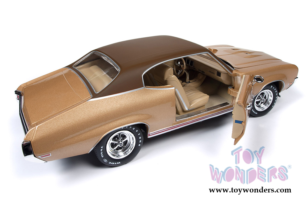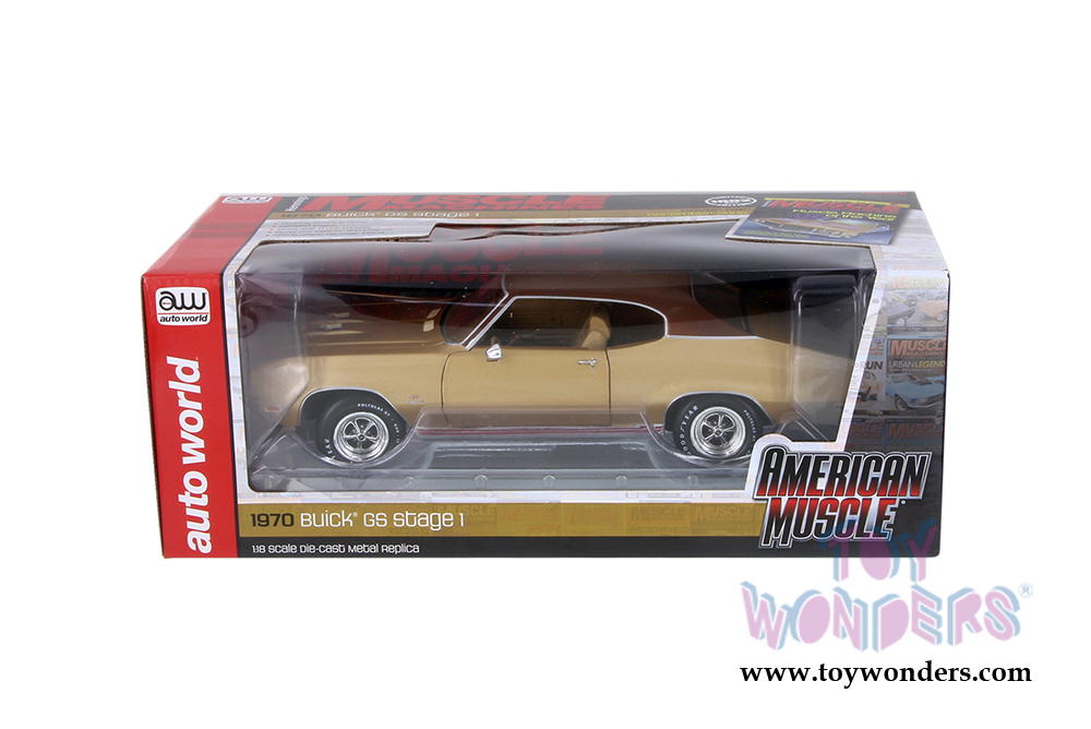 AMM1105 Auto World American Muscle - Hemmings Muscle Machines | 1970 Buick® Skylark™ GS Stage 1 Hardtop. 1:18 scale diecast collectible model car. This Buick is an 11"L x 4"W x 3"H diecast metal car with openable hood and doors, steerable front wheels, detailed engine, accurate interior and chassis. This 1970 Buick GS is manufactured by Auto World. Individually packed in a window box. Box size: 13.25"Lx 6.1"Wx 5"H. AMM1105 is in GOLD color. Limited Edition to 1002 pcs.
