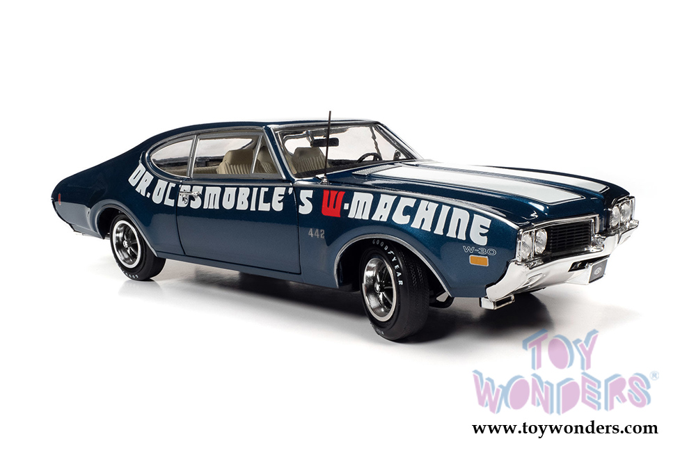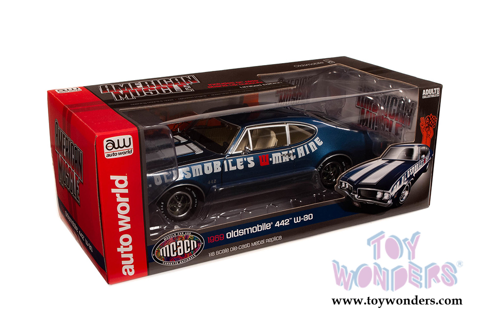 Auto World American Muscle - Oldsmobile® 442 W-30 Coupe Muscle Car & Corvette Nationals (MCACN) (1969, 1/18 scale diecast model car, Trophy Blue/White) AMM1235
