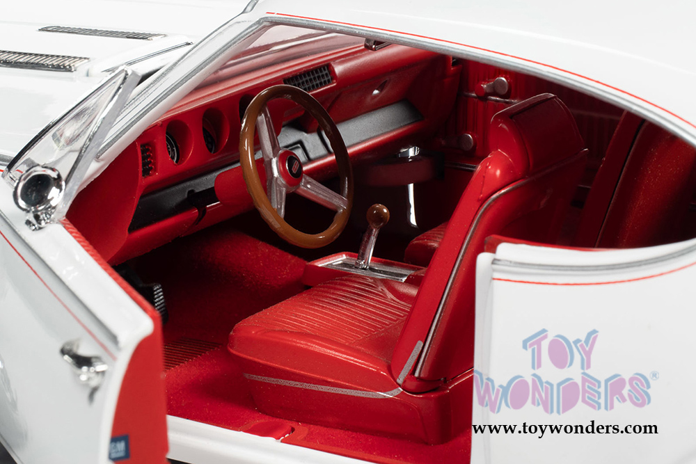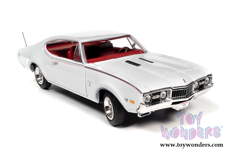 AMM1208 Auto World - American Muscle - 1968 Oldsmobile Cutlass S W31 Hardtop Muscle Car & Corvette Nationals (MCACN). 1:18 scale diecast collectible model car. This Cutlass is an 11.25"L x 4.25"W x 3"H diecast metal car with openable hood and doors. Featuring steerable front wheels, detailed engine, accurate interior, and chassis. This '68 Oldsmobile is manufactured by Auto World. Individually packed in a window box. Box size: 13.25"L x 6.25"W x 5"H. AMM1208 is in white with a red interior. Limited edition.