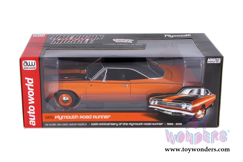 Auto World - American Muscle | Plymouth Road Runner Hard Top Looney Tunes™ 50th Anniversary (1969, 1/18 scale diecast model car, Omaha Orange) AMM1131