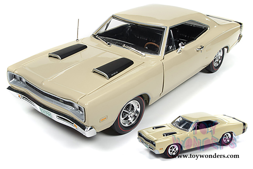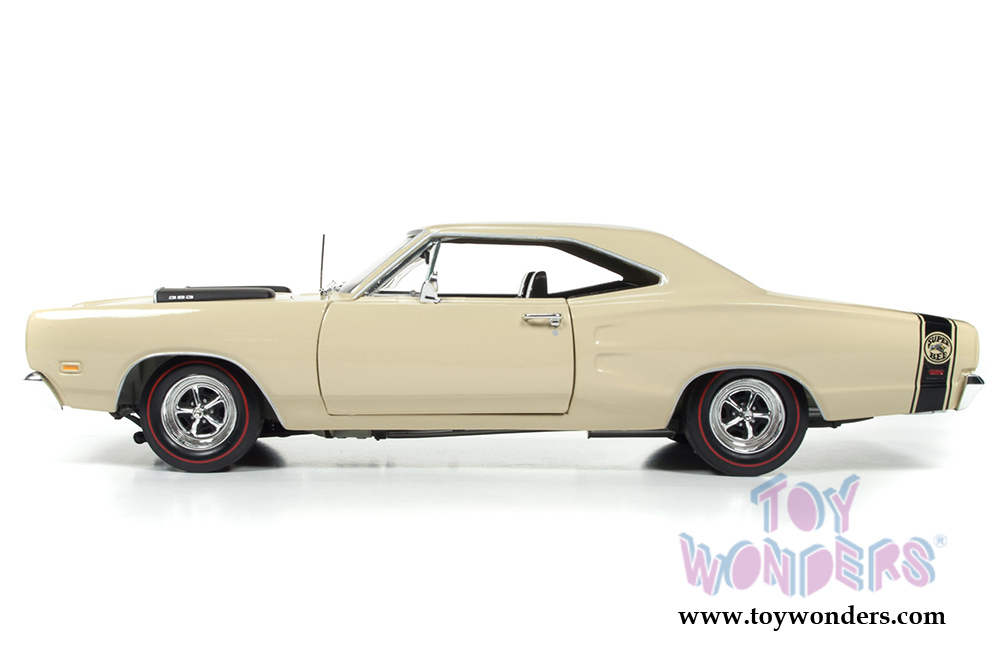 AMM1094 Auto World - 1969 Dodge Coronet Super Bee Hard Top. 1:18 scale diecast collectible model car. This '69 Dodge Super Bee is an 11"L x 4"W x 3"H die-cast metal car with openable hood, doors and trunk, steerable front wheels. Manufactured by Auto World. Individually packed in a window box. Box size: 13.25"Lx 6.1"Wx 5"H. AMM1094 is in Y3 CREAM color.