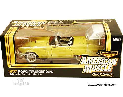 AMM940 Auto World ERTL Authentics American Muscle - 1957 Ford Thunderbird Convertible w/ Removable Bonnet. 1:18 scale diecast collectible model car. This Ford Thunderbird is a 9.5"L x 4"W x 2.75"H die-cast metal car with openable hood, doors and trunk, steerable front wheels, and detailed engine, accurate interior, chassis and trunk. This 1957 Ford Thunderbird is manufactured by Auto World. Individually packed in a window box. Box size: 13.25"L x 6.1"W x 5"H. AMM940 is in INCA GOLD color (like yellow).