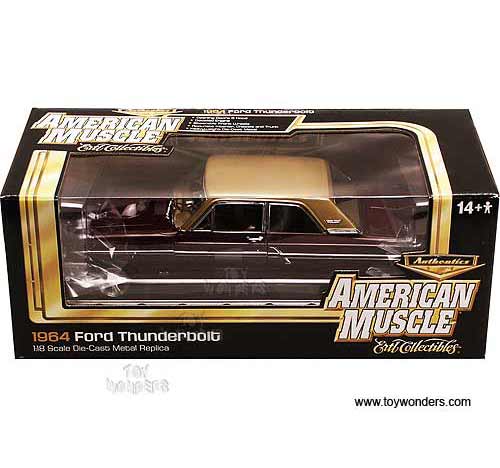 AMM915BG Auto World ERTL Authentics American Muscle - 1964 Ford Thunderbolt Hard Top. 1:18 scale diecast collectible model car. This Ford Thunderbolt is a 10.5"L x 3.75"W x 3"H die-cast metal car with openable hood, doors and trunk, steerable front wheels, and detailed engine, accurate interior, chassis and trunk. This 64 Ford Thunderbolt is manufactured by Auto World. Individually packed in a window box. Box size: 13.25"Lx 6.1"Wx 5"H. AMM915 is in BURGUNDY color with Gold roof.