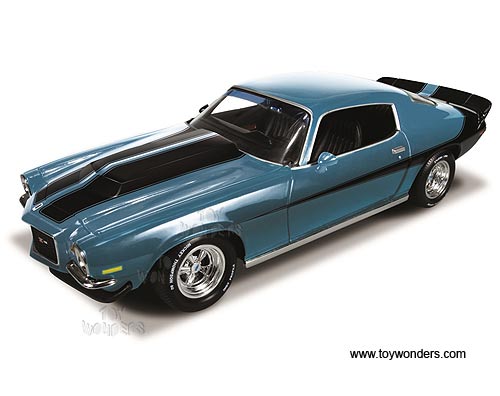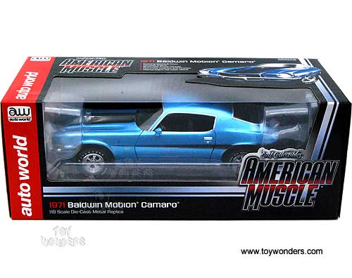 AMM1013 Auto World ERTL American Muscle - 1971 Chevy Camaro Baldwin Motion Hard Top. 1:18 scale diecast collectible model car. This Chevrolet Camaro Baldwin Motion is a 10"L x 4"W x 2.75"H die-cast metal car with openable hood & doors, steerable front wheels, and detailed engine, accurate interior and chassis. This 71 Chevy Camaro Baldwin Motion is manufactured by Auto World. Individually packed in a window box. Box size: 13.25"L x 6.1"W x 5"H. AMM1013 is in BLUE color with Black stripes. GM is a trademark of the General Motors Corporation.