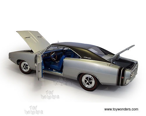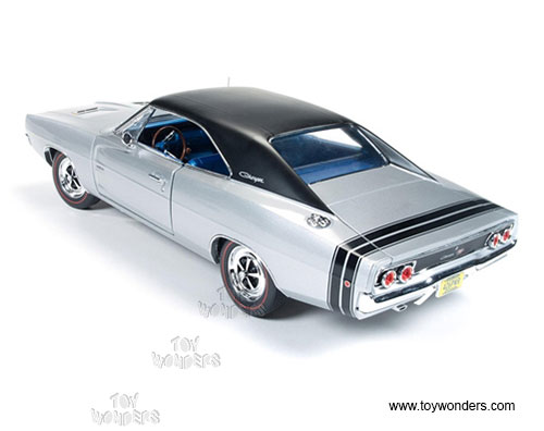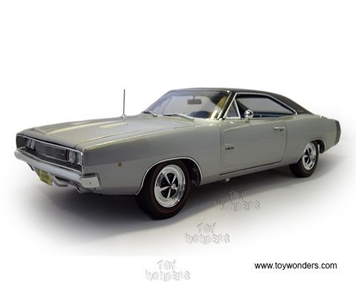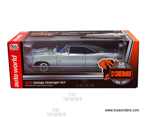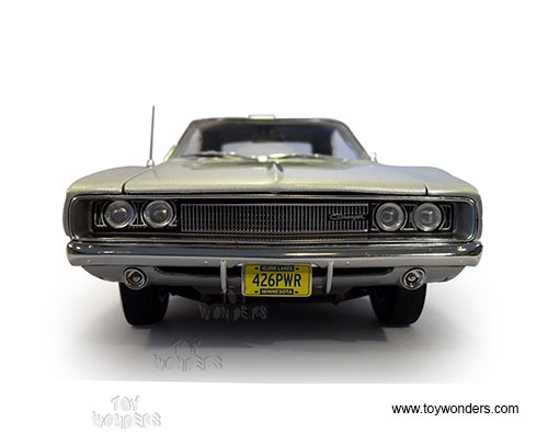 AMM1033 Auto World ERTL American Muscle - 1968 Dodge Charger Hard Top. 1:18 scale diecast collectible model car. This Dodge Charger is a 11"L x 4"W x 3"H die-cast metal car with openable hood, doors and trunk, steerable front wheels, and detailed engine, accurate interior, and chassis. This '68 Dodge Charger is manufactured by Auto World. Individually packed in a window box. Box size: 13.25"Lx 6.1"Wx 5"H. AMM1033 is in SILVER color. GM is a trademark of the General Motors Corporations.
