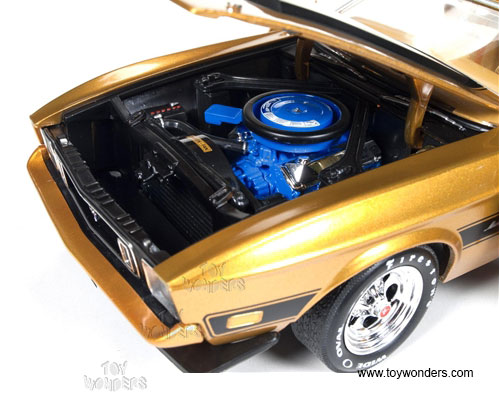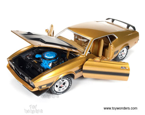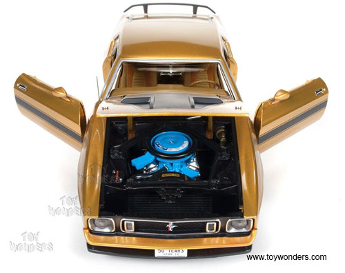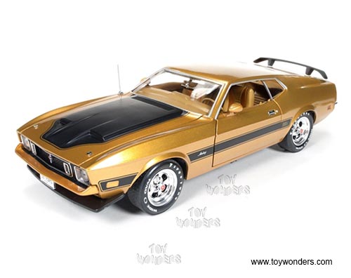 AMM1043 Auto World ERTL American Muscle - 1973 Ford Mustang Mach 1 Hard Top. 1:18 scale diecast collectible model car. This Mustang is a 10.5"L x 4"W x 3"H die-cast metal car with opening hood, doors and trunk, steerable front wheels, and detailed engine, accurate interior, chassis & trunk. This '73 Ford Mustang is manufactured by Auto World. Individually packed in a window box. Box size: 13.25"Lx 6.1"Wx 5"H. AMM1043 is in GOLD color.