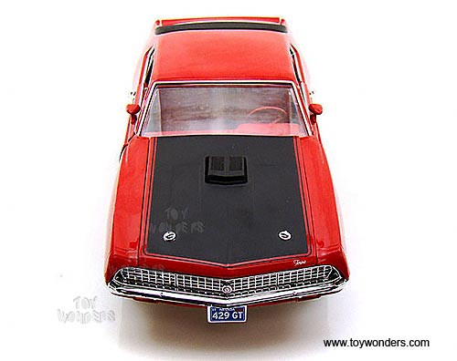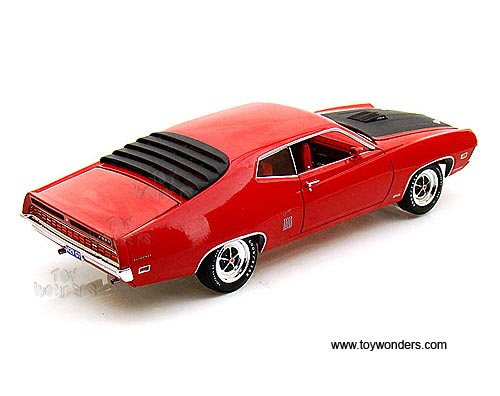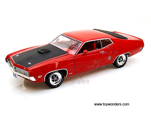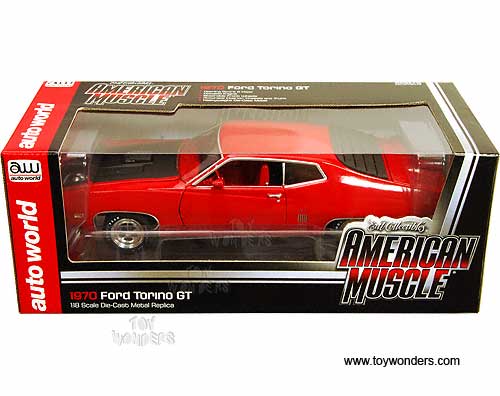 AMM975 Auto World ERTL American Muscle - 1970 Ford Torino GT Hard Top. 1:18 scale diecast collectible model car. This Ford Torino GT is an 11.75"L x 4"W x 3"H die-cast metal car with openable hood, doors and trunk, steerable front wheels, and detailed engine, accurate interior, chassis and trunk. This 70 Ford Torino GT is manufactured by Auto World. Individually packed in a window box. Box size: 13.25"Lx 6.1"Wx 5"H. AMM975 is in RED color with Black hood.