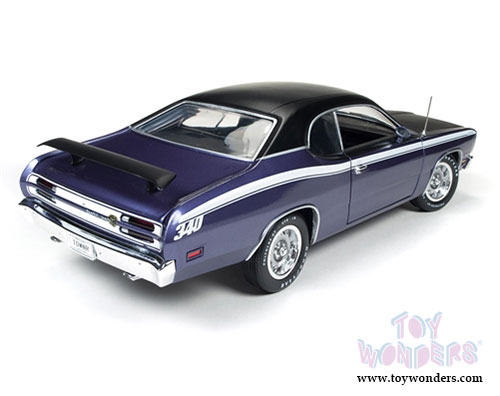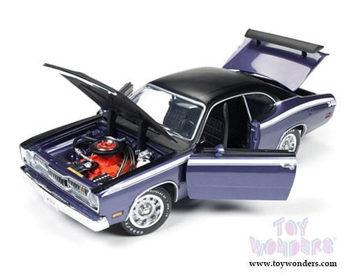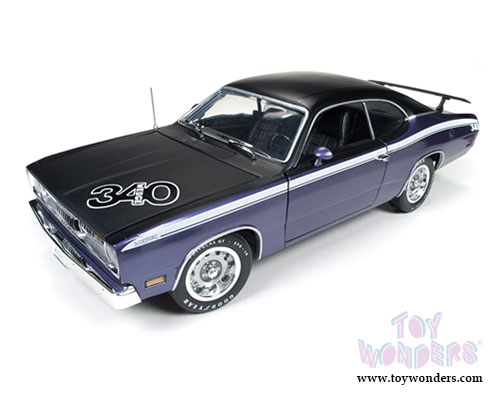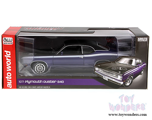AMM1052 Auto World ERTL American Muscle - 1971 Plymouth Duster 340 Hard Top. 1:18 scale diecast collectible model car. This Plymouth is a 10.5"L x 4"W x 3"H heavyweight die-cast metal car with openable hood, doors and trunk, FC7 Violet Metallic Exterior, steerable front wheels, detailed engine, accurate interior and chassis. This '71 Plymouth Duster is manufactured by Auto World. Individually packed in a window box. Box size: 13.25"Lx 6.1"Wx 5"H. AMM1051 is in PURPLE color with black roof and hood.