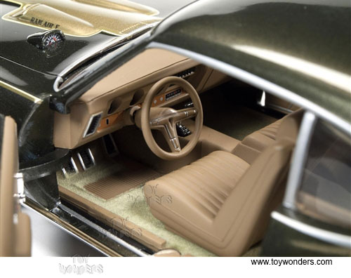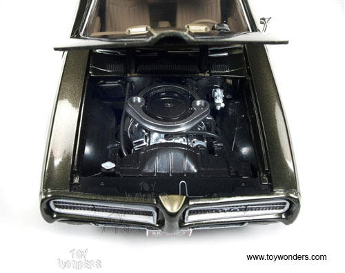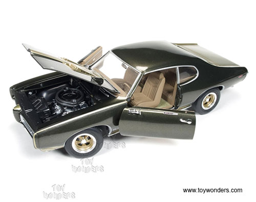 AMM1042 Auto World ERTL American Muscle - 1969 Pontiac GTO Hard Top. 1:18 scale diecast collectible model car. This Pontiac GTO is a 11"L x 4.25"W x 3"H die-cast metal car with openable hood, doors and trunk, steerable front wheels, and detailed engine, accurate interior, chassis & trunk. This '69 Pontiac GTO is manufactured by Auto World. Individually packed in a window box. Box size: 13.25"Lx 6.1"Wx 5"H. AMM1042 is in EXPRESSO BROWN color. GM is a trademark of the General Motors Corporations.