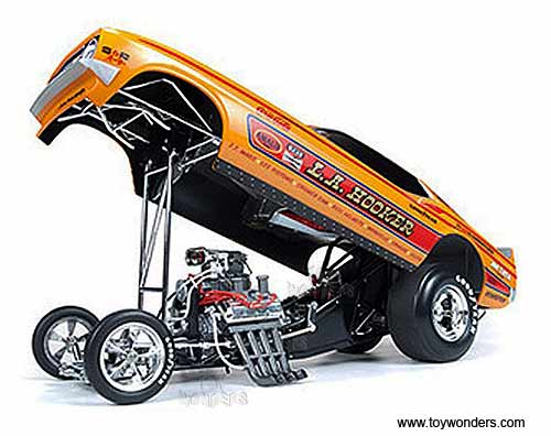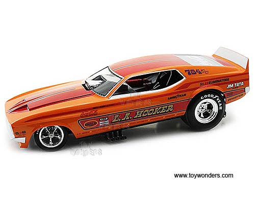 AW1106 Auto World Legends of The Quarter Mile - L.A. Hooker - 1971 Ford Mustang NHRA Funny Car. 1:18 scale diecast collectible model car. This Ford Mustang is a 10"L x 3.5"W x 2.5"H car with plastic body, diecast tube chassis, plumbed and wired engine. This 1971 Ford Mustang is manufactured by Auto World. Individually packed in a window box. Box size: 13"L x 6.1"W x 5"H. AW1106 is in ORANGE color with Red stripes.