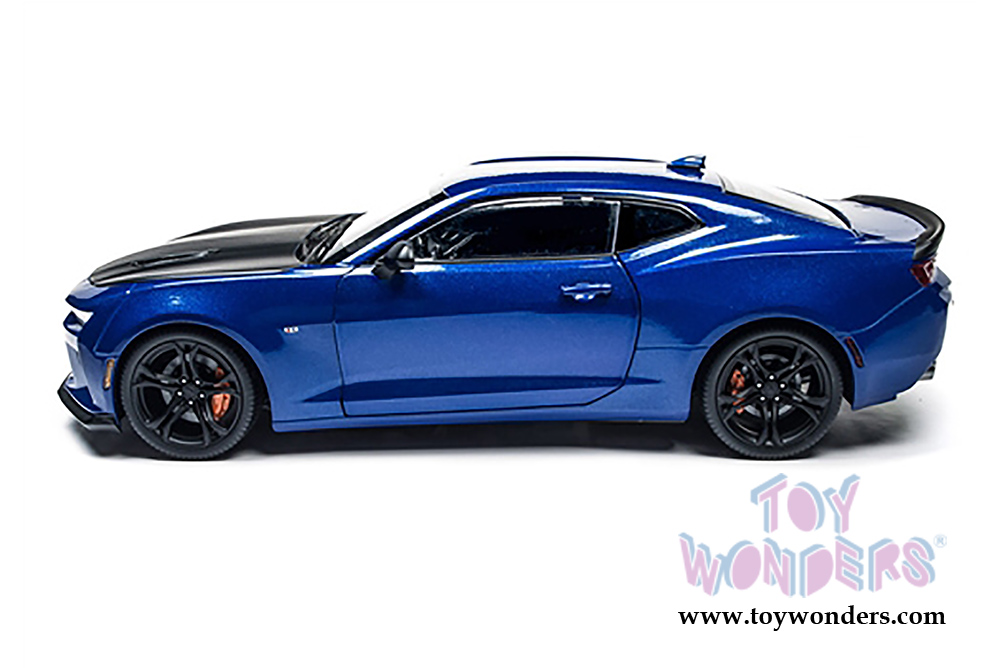 AW241 Auto World - Muscle Cars USA | 2017 Chevy® Camaro® SS™ 1LE 50th Anniversary Hardtop. 1:18 scale diecast collectible model car. This Chevrolet Camaro is a 10"L x 4"W x 3"H diecast metal car with openable hood, doors and trunk, steerable front wheels, and detailed engine, accurate interior, chassis and trunk. This 2017 Chevy Camaro is manufactured by Auto World. Individually packed in a window box. Box size: 13.25"L x 6.1"W x 5"H. AW241 is in Hyper BLUE color. GM is a trademark of the General Motors Corporation.