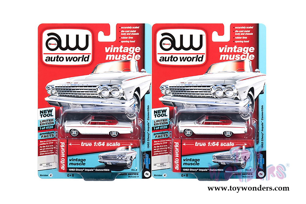 AWSP014/24A Auto World Premium - 2018 Release 4 | 1962 Chevrolet® Impala™ Convertible. 1:64 scale diecast collectible model. 6-car set. These cars are 3.25" long diecast metal cars. These cars feature detailed diecast metal body and chassis, authentic factory colors and accurately scaled matching rims with rubber tires, opening hoods. Each car individually blister carded. Card size: 5.5" x 7.5". 6 pcs/inner. Manufactured by Auto World. AWSP014/24A is in WHITE with Red interior. Limited edition to 4128 pcs.