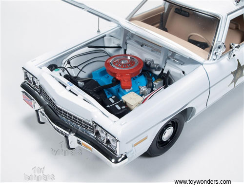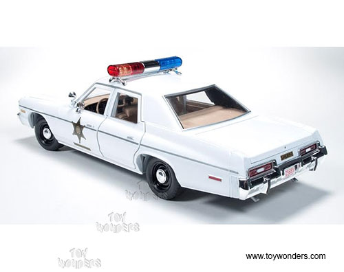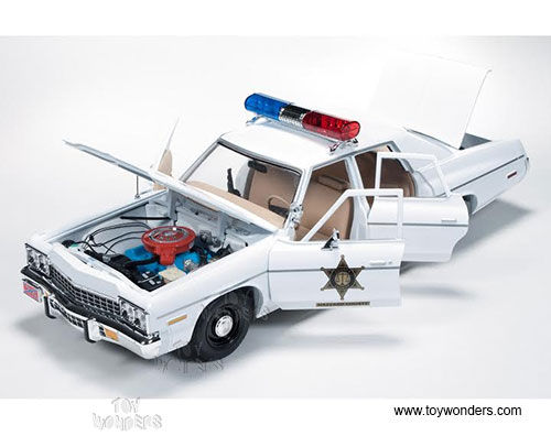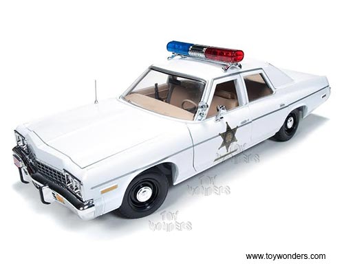 AWSS107 Auto World Silver Screen Machines - The Dukes of Hazzard Police Car 1975 Dodge Monaco Hard Top. 1:18 scale diecast model car. This Dodge Monaco is an 11"L x 4"W x 3.25"H diecast metal muscle car with workable steering, and openable hood, doors & trunk. Detailed engine, accurate interior, chassis & trunk. AWSS107 is in WHITE. Individually packed in a window box. Box size: 13.25"L x 6.1"W x 5"H.