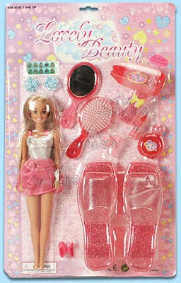 2216/7 B/O Beauty Set. Beauty set comes with 11.5" doll, mirror, brush, hair dryer, hair pins, real shoes, stickers, and requires batteries. Card Size: 18.5"x12".