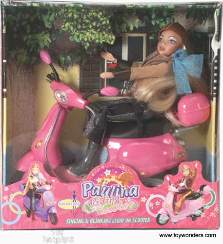 12166SDD B/O Paulina Riding Scooter. 12” battery operated singing poseable doll. Includes bump and go scooter, flashing lights and storage box for stowing helmet. Requires 3 “AA” batteries. Box size: 12.5" x 13" x 3.5". 9 pcs/inner.