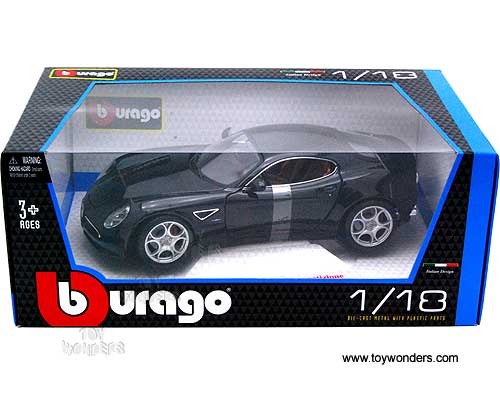 12077 BBurago - Alfa 8C Competizione Hardtop. 1:18 scale diecast collectible model car. This Alfa 8C Competizione is an 8.75"Lx 4"Wx 2.5"H diecast metal car with openable hood, doors, and trunk. Italian design. This Alfa 8C Competizione is manufactured by BBurago. 18-12077 is in BLACK color. Individually packed in a window box. Box size: 11.75"Lx 7"Wx 4.75"H.