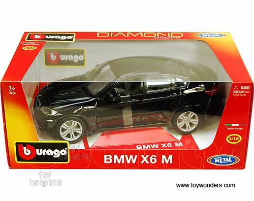 11032BK BBurago Diamond - BMW X6 M Hard Top. 1:18 scale diecast collectible model car. This BMW X6M is a 9.5"L x 3.75"W x 3.25"H die cast metal car with openable hood, doors & trunk. Italian design. The BMW X6 M is manufactured by BBurago. Item 11032 is in BLACK color. Individually packed in a window box. Box size: 11.75"L x 7"W x 4.75"H.
