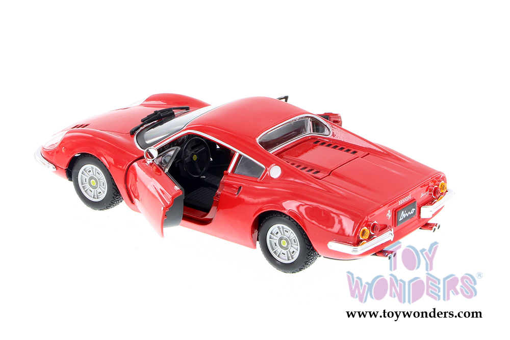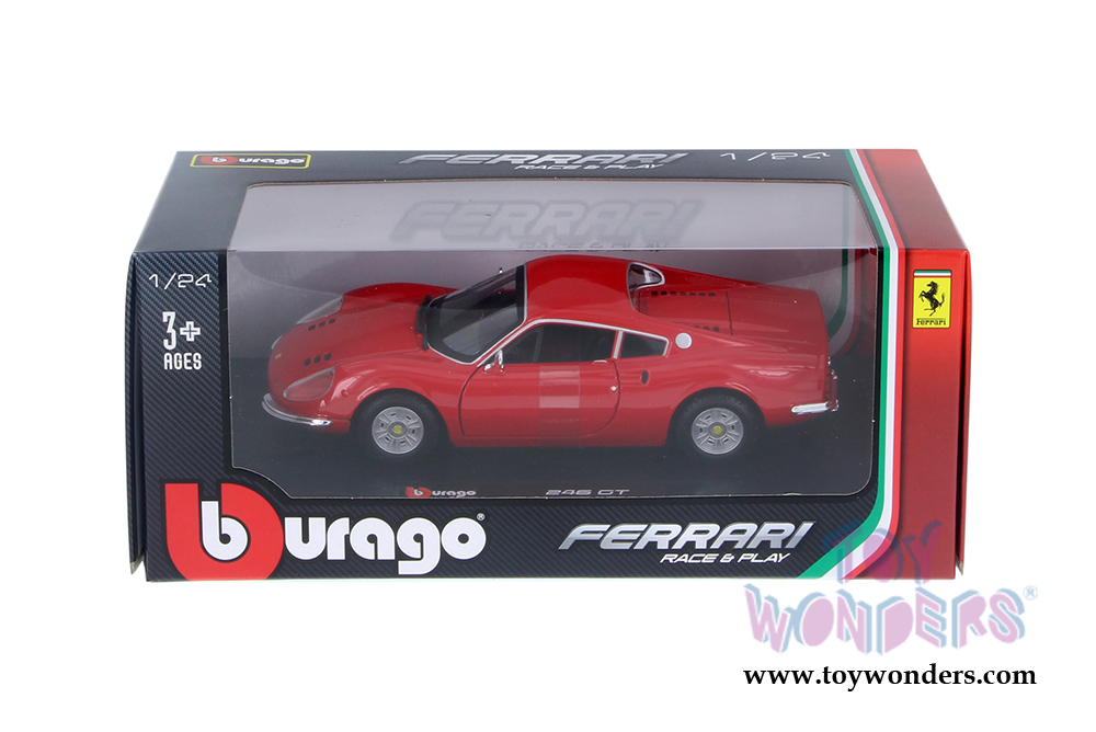 26015R BBurago Ferrari Race & Play - Ferrari 246 GTB Hard Top. 1:24 scale diecast collectible model car. This Ferrari a 7"L x 3"W x 2"H die-cast metal car with openable side doors. Italian design. This Ferrari 246 GTB is manufactured by Bburago. Item 26015R is in RED color. Individually packed in a window box. Box size: 9.5"L x 5"W x 4"H.