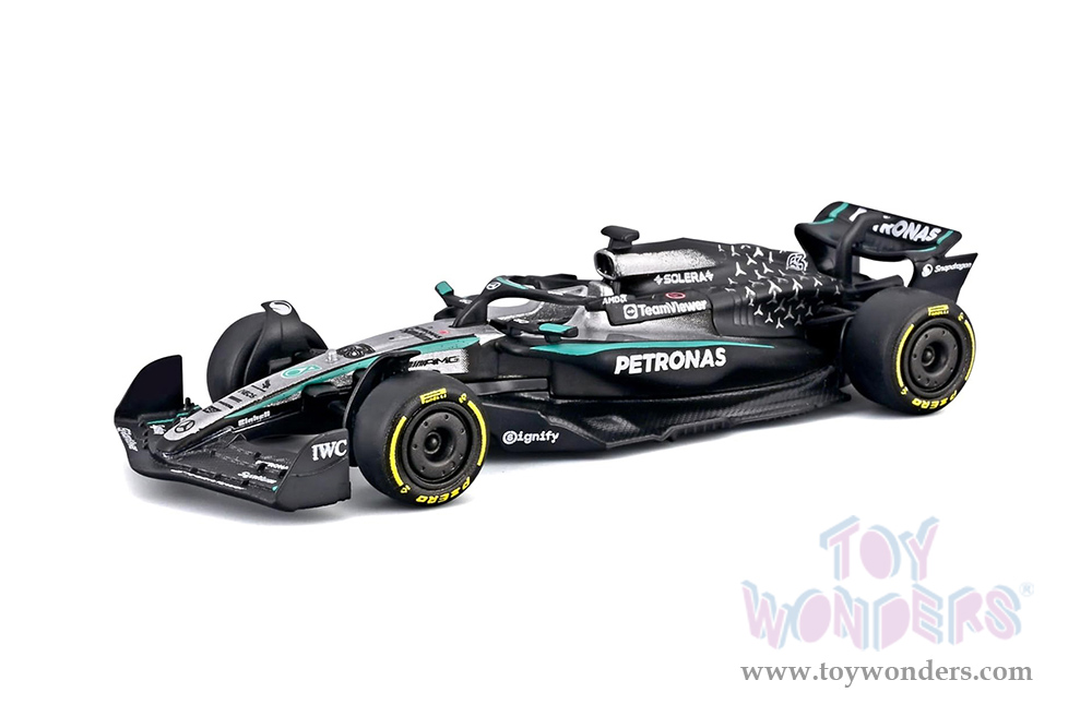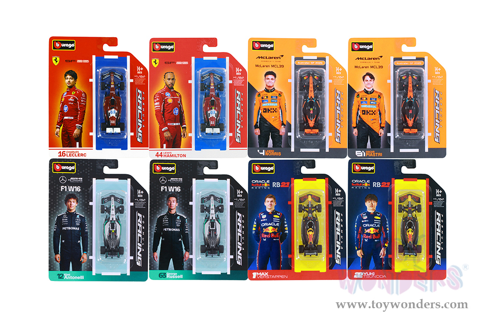 18-60164 Formula Racing - Formula One F1 (2025) Assorted. 1:64 scale diecast collectible model car. These racing cars are 3.25"L x 1.25"W x .75"H die-cast metal car. Extensive detail across the body, electrostatic paint coating. Sponsored by Honda, Mobil, Oracle, Esso and more. These Formula one collection is manufactured by Bburago. Item 18-60164 is in assorted colors and styles. Each car individually blister carded. Card size: 6.75" x 5.375".