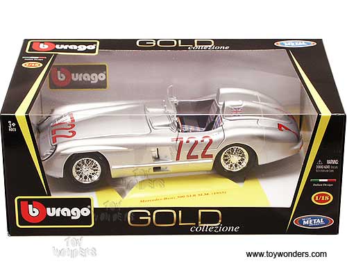 12054 BBurago Gold - 1955 Mercedes-Benz 300 SLR M.M. Convertible #722. 1:18 scale diecast collectible model car. This classic Mercedes Benz 300 SLR M.M. is a 9.5"L x 3.5"W x 2.5"H die cast metal car with openable hood. Italian design. The Mercedes-Benz 300-SLR M.M. is manufactured by BBurago. 12054 is in SILVER color. Individually packed in a window box. Box size: 11.6"L x 7"W x 4.75"H.