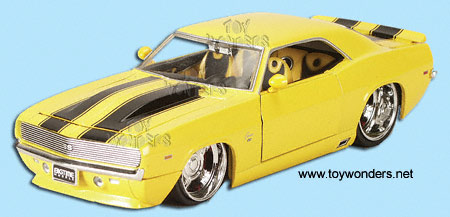 90210IR DUB City Bigtime Muscle 1969 Chevy Camaro. 1:24 scale diecast model car. This 1969 Chevrolet Camaro is a 7.75" long diecast with opening doors/hood/trunk and Colorado Rims. This 69 Chevy Camaro is manufactured by Jada Toys. 4 pcs per display box. 90210 in assorted colors.