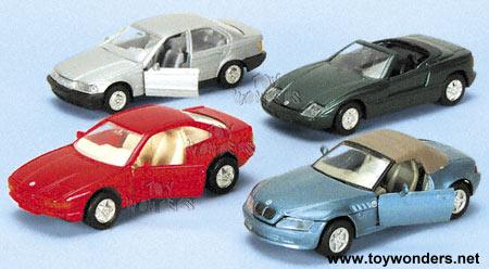 B9720D BMW Series. 1:36 to 1:38 scale. 4.5"L diecast metal pullback motor action and opening doors and hood. Assorted styles that include the BMW 328i, BMW 850i, BMW 325i, and BMW Z3. Asstd. Colors. Welly. 12 pcs per display box. 72 pcs per inner box.