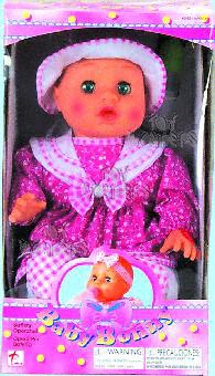 1678/1 Baby Bonny 12" doll. Press her hands she cries, laughs & shakes her legs. Feed her magic bottle, her mouth moves with sucking sound, take out the bottle she laughs. In a "TRY ME" box. Includes 3 "AA" batteries. Box size: 7.25"Lx7"Wx12.5"H.