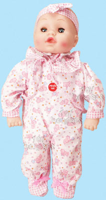 PT1686E Baby Huggy. 15.75" baby doll speaks different phases when feet and hands are pushed. Includes a baby bottle. Requires 3 "AA" batteries. Box size: 8"Lx4.75"Wx16.75"H. 6 pcs/inner.