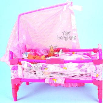 9375 Baby Ruby - Sleeping Bed. 15" stuffed baby doll that laughs and cries in 15"Lx8"Wx9"H crib. requires 2 "AA" batteries. box size: 13.5"Lx3.75"Wx14.75"H.