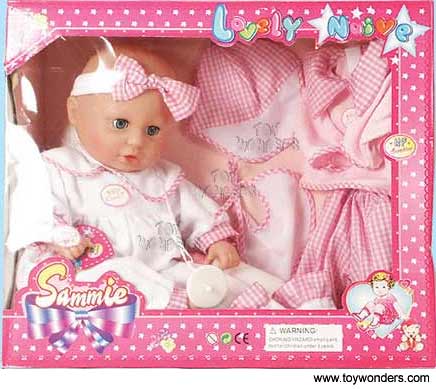 161733 Baby Sammie Doll Play Set. 19" soft doll in white/pink outfit. Eyes open & shut. Accessories include pacifier, baby bottle, mittens, bib, cap, & outfit. Box size: 17"Lx 5.25"Wx 14.5"H.