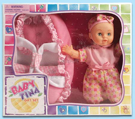 82080 Baby Tina Gift Set. 9" Soft doll in pink outfit. Eyes open/shut. Includes pink baby basket carrier. Box size: 12"L x 2.5"W x 10.5"H.