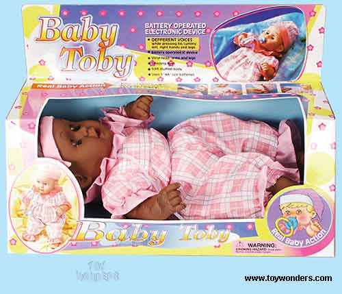 20428B Baby Toby (Dark). 16" baby features soft stuffed body, vinyl head, arms & legs, sleeping eyes. Press his tummy, hands & legs, he will speak, cry & laugh. Feed him with a pacifier, he really draws with sucking voice. Requires 3 "AA" batteries (included). Box size: 15.5"Lx 7.25"Wx 6.25"H. 6 pcs/inner.