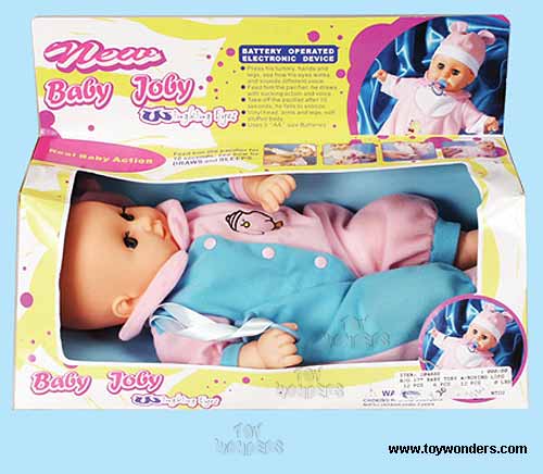20488S Baby Toby w/ Moving Lips. 16" baby features soft body, vinyl head, arms & legs, and sleeping eyes. He will speak and cry & laugh while pressing his tummy, hands and feet. Feed him with a pacifier, he really draws with sucking voice. Requires 3 "AA" batteries (included). Box size: 15.25"Lx 7"Wx 6.25"H. 6 pcs/inner.