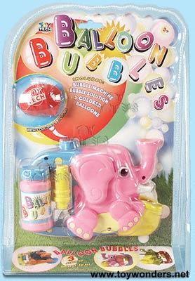 72151 Balloon Bubbles. Contains a bubble machine, bubble solution, 3 colored balloons. Assorted styles: lion, elephant, crocodile, baby chick, rabbit, etc. Need to blow to make it work. Card size: 12.5"x8.75".